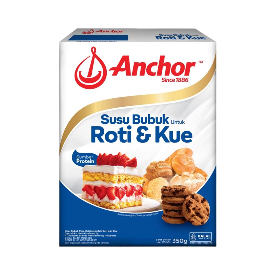 Anchor Susu Bubuk untuk Roti & Kue 350gr merupakan susu bubuk khusus untuk kebutuhan roti dan kue yang membantu menghasilkan tekstur lebih lembut serta rasa lebih kaya. Mudah larut dan praktis digunakan dalam berbagai resep bakery. Cocok untuk adonan rumahan maupun kebutuhan usaha.