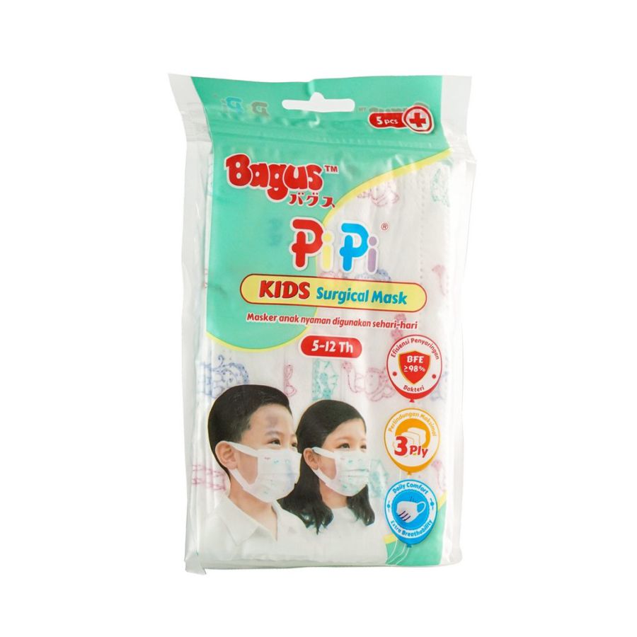 Bagus PiPi Kids Surgical Mask adalah masker medis 3 ply yang di-design khusus untuk anak-anak yang dapat digunakan dalam beraktifitas sehari-hari dengan earloop yang lebih besar sehingga lebih nyaman. Masker ini lebih nyaman dan aman dalam bernafas, Melindungi dan menutupi area hidung dan mulut secara sempurna, Mampu menyaring particle kecil, droplets dan bakteri lebih dari 98%, dan Dilengkapi dengan lapisan Meltblown Non-Woven untuk menyaring virus dan bakteri.