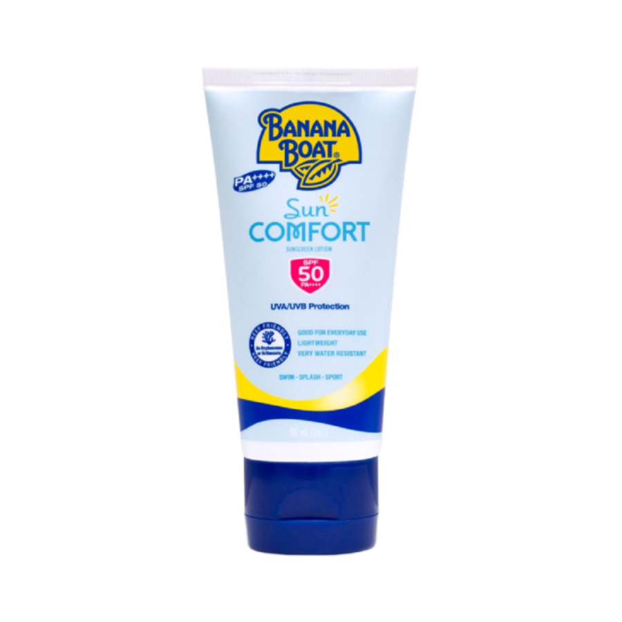 Banana Boat Sun Comfort Sunscreen Lotion SPF 50 PA+++ adalah lotion tabir surya ringan yang melindungi kulit dari sinar UVA dan UVB, sekaligus melembapkan serta mengurangi rasa kering akibat paparan sinar matahari, air laut, atau kolam renang.