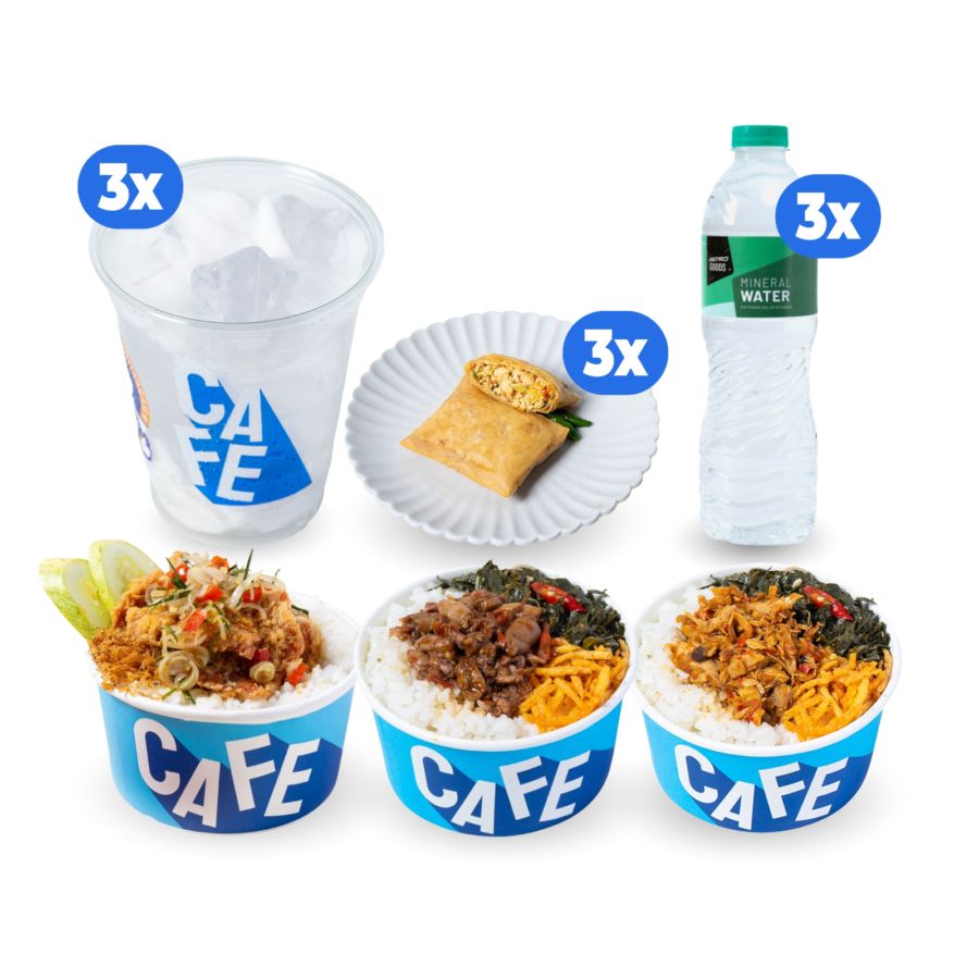 Bundle berisi:- 1 pcs Rice Bowl Cakalang- 1 pcs Rice Bowl Cumi Rica- 1 pcs Nasi Kulit Ayam Crispy Sambal Matah- 3 pcs Mineral Water Astro Goods Botol 600 ml- 3 pcs Martabak Tahu- 3 pcs Es Kelapa Muda 12 oz x Amritsaraje