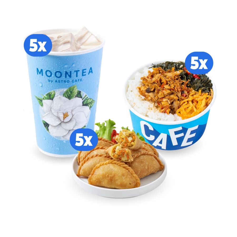 Bundle berisi:- 5 pcs Rice Bowl Cakalang- 5 pcs Moontea Peach Oolong Milk Tea - Regular- 5 pcs Pastel