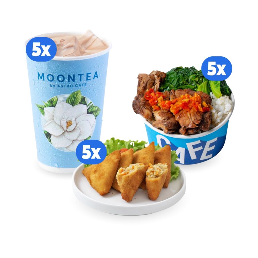 Bundle berisi:- 5 pcs Roasted Chicken Rice Bowl- 5 pcs Moontea Roasted Oolong Milk Tea - Regular- 5 pcs Risol Ragout Ayam