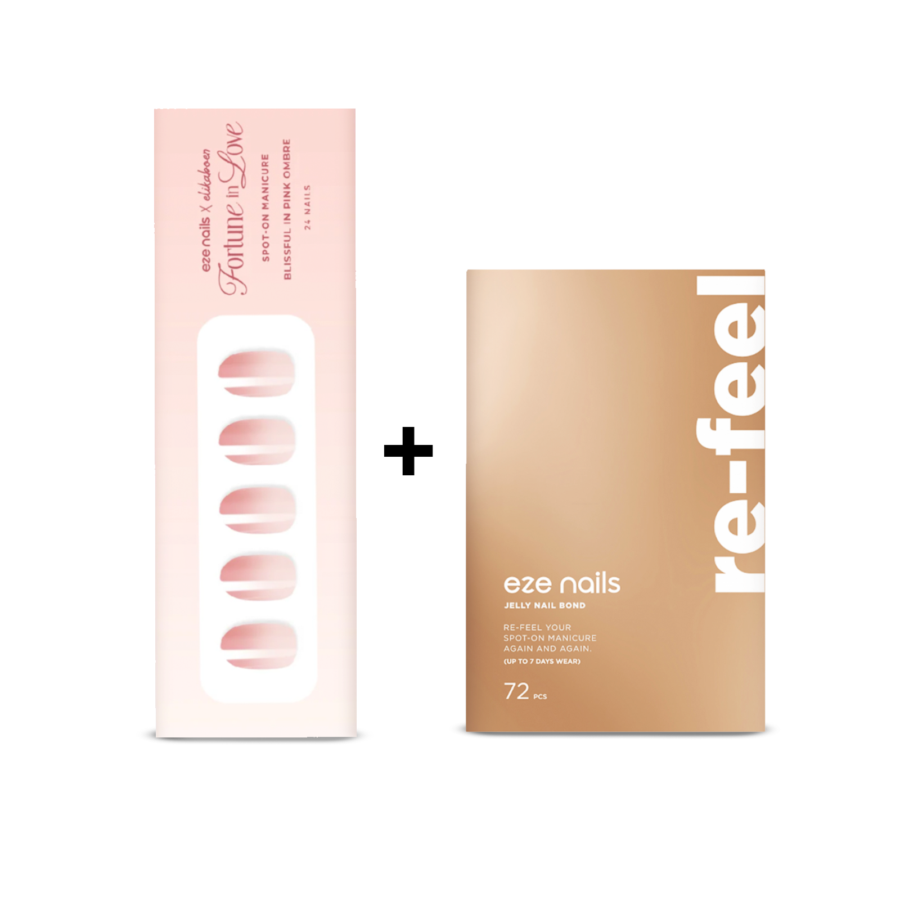 Bundle berisi:- Eze Nails Blissful In Pink Ombre (Kuku Palsu Tempel) 1 Packs- Eze Nais Refeel Manicure (Lem Kuku Palsu Tempel) 1 Packs