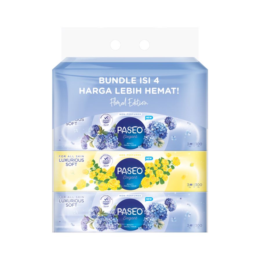 Tisu wajah Paseo Elegant Luxurious Soft Floral Edition bundle isi 4 dengan ketebalan 3 ply dan 300 lembar per kotak, terbuat dari 100 persen serat alami yang bebas bahan kimia berbahaya, lembut di kulit, serta kuat dan praktis untuk penggunaan sehari hari bagi seluruh keluarga.