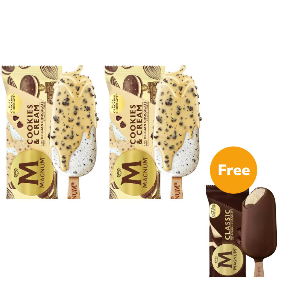 Nikmati kemewahan Magnum Cookies & Cream, es krim rasa cookies & cream yang lembut dilapisi cokelat putih Belgia dengan potongan biskuit renyah