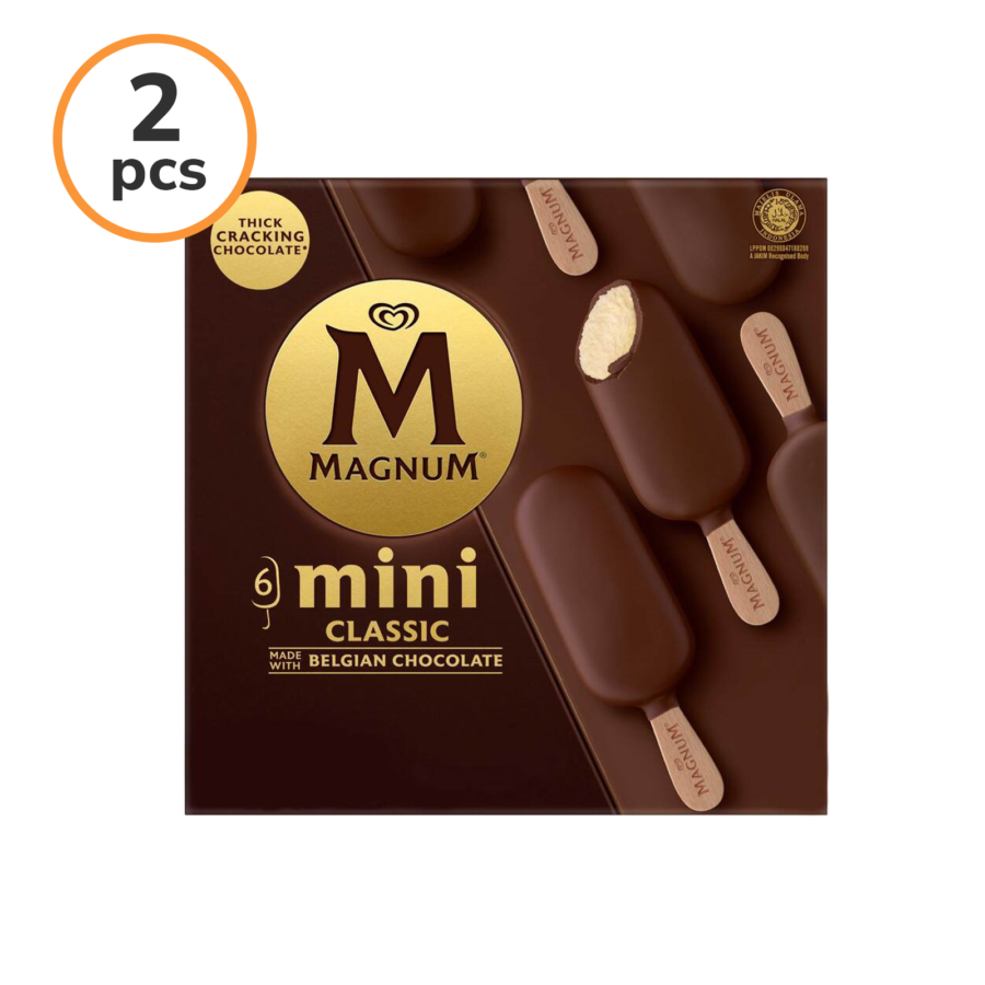 Magnum Mini Multipack, berisi 6pcs Magnum Classic Mini 45ml, es krim vanilla lembut dengan balutan cokelat Belgia tebal.