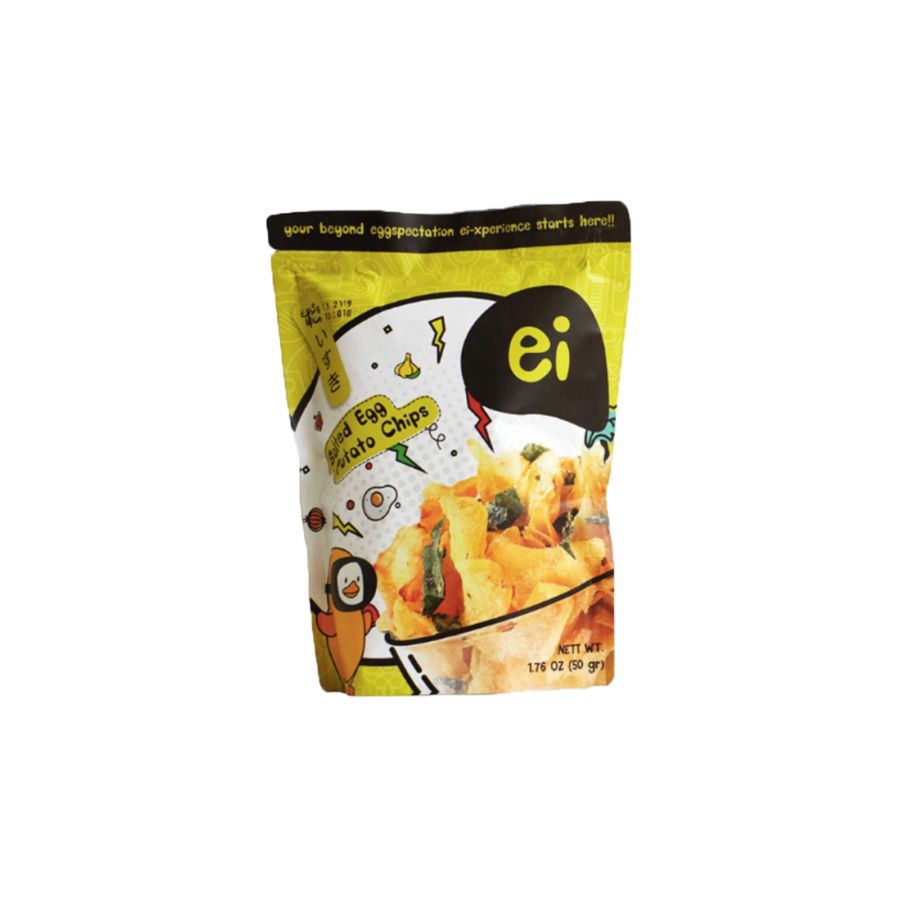 Ei Salted Egg Potato Chips ini dibuat dengan irisan kentang tipis yang renyah dan dibalur dengan resep spesial telur asin dari Ei.
