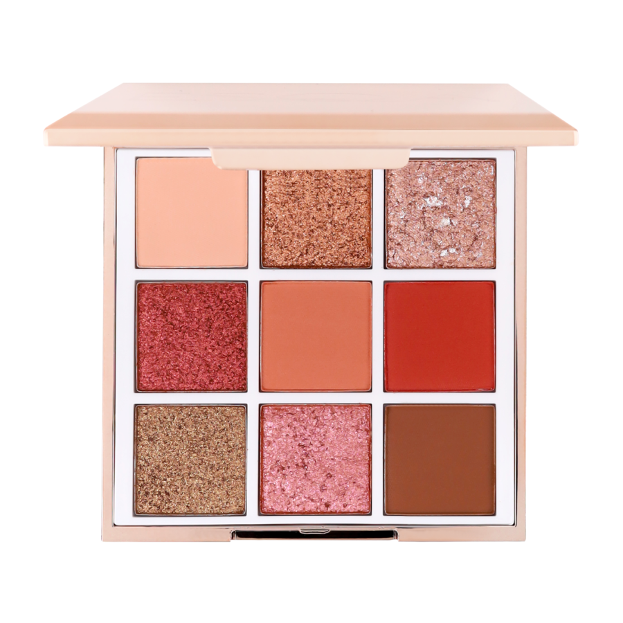 Palet eyeshadow SQA Goddess varian Peach dengan empat jenis finis: matte, satin, pressed pearl, dan shimmer topper. Vegan dan halal.