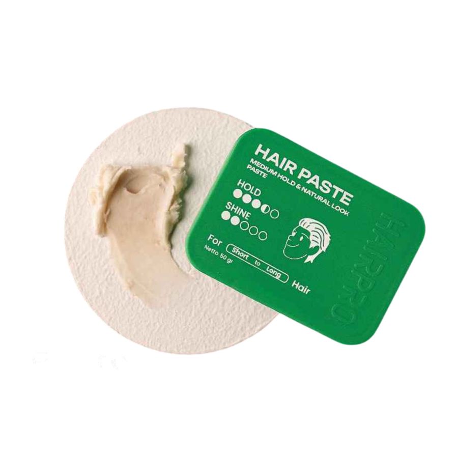 Hair Paste adalah produk styling rambut yang serbaguna, digunakan untuk menata berbagai jenis rambut lurus hingga bergelombang dengan memberikan tekstur, volume, dan gaya cengkram yang sedang (medium hold), dengan hasil akhir matte look (tidak berkilau)