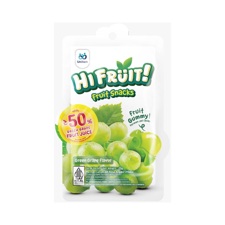 Nikmati camilan buah yang lezat dan menyegarkan dengan HI FRUIT! Fruit Snacks Green Grape Flavor, snack ringan yang menghadirkan rasa anggur hijau yang manis dan menyegarkan dalam setiap gigitan. Camilan ini terbuat dari perisa buah anggur hijau yang autentik, memberikan sensasi rasa buah yang kuat dan nikmat untuk dinikmati kapan saja.