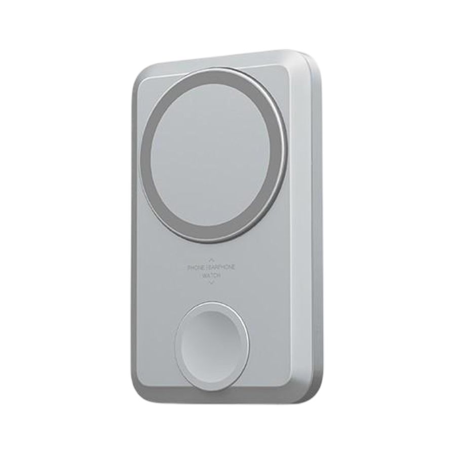 Power bank 2‑in‑1 ini menggabungkan kapasitas besar 10 000 mAh dengan desain ringkas dan portabel, dilengkapi dua modul magnetik internal yang memungkinkan pengisian nirkabel hingga 15 W untuk iPhone atau earphone, serta 2,5 W khusus untuk Apple Watch