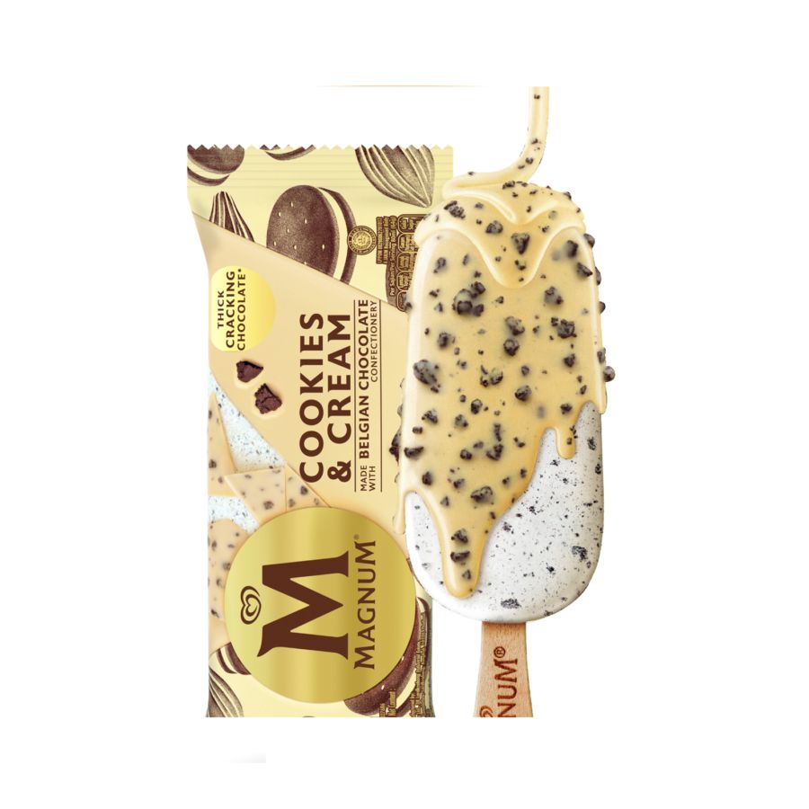 Nikmati kemewahan Magnum Cookies & Cream, es krim rasa cookies & cream yang lembut dilapisi cokelat putih Belgia dengan potongan biskuit renyah