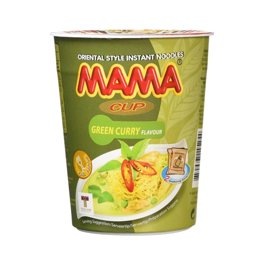 Mama Cup Noodle Green Curry 90gr cocok buat kamu yang kangen rasa green curry khas Thailand dengan cara super praktis, kuahnya creamy gurih dengan aroma rempah dan sedikit pedas yang hangat di tenggorokan, mi-nya kenyal dan enak banget disantap saat hujan, lembur, atau kapan saja lagi pengen mangkuk mi kuah beraroma eksotis tanpa perlu repot masak bumbu dari awal.