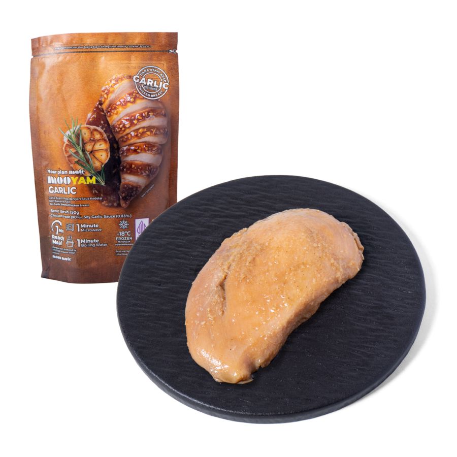 Mooyam Garlic 150g adalah dada ayam asap premium siap saji, praktis, tinggi protein (sekitar 36g per kemasan), rendah garam, tanpa tambahan pengawet, dibuat dari ayam tanpa hormon/antibiotik, dengan rasa gurih bawang putih dan saus kedelai, aman dikonsumsi langsung atau dipanaskan, cocok untuk gaya hidup sehat.