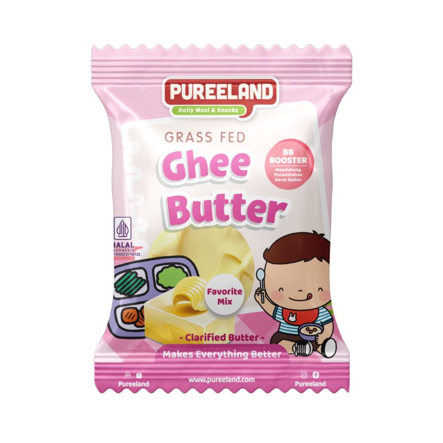 Pureeland Grass Fed Ghee Butter Favorit Mix BB Booster 30 gram adalah ghee butter dari susu sapi grass fed yang dirancang sebagai penambah lemak baik untuk membantu meningkatkan kalori pada menu MPASI dan makanan anak. Praktis dalam kemasan 30 gram, cocok untuk stok harian sebagai booster kalori saat anak membutuhkan tambahan energi.
