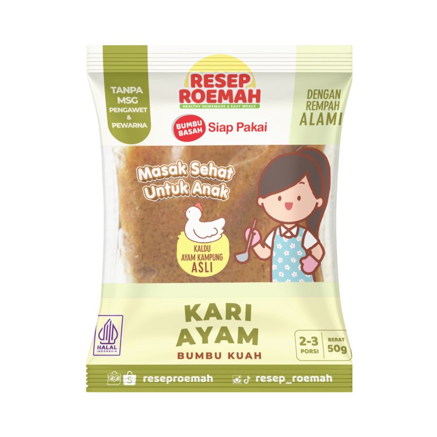 Resep Roemah Bumbu Kuah Instant Anak Kari Ayam 50gr merupakan bumbu basah siap pakai dengan aroma kari khas yang lembut dan gurih. Mengandung kaldu ayam kampung asli dan rempah pilihan, memberikan rasa kari yang tidak pedas dan cocok untuk anak-anak.