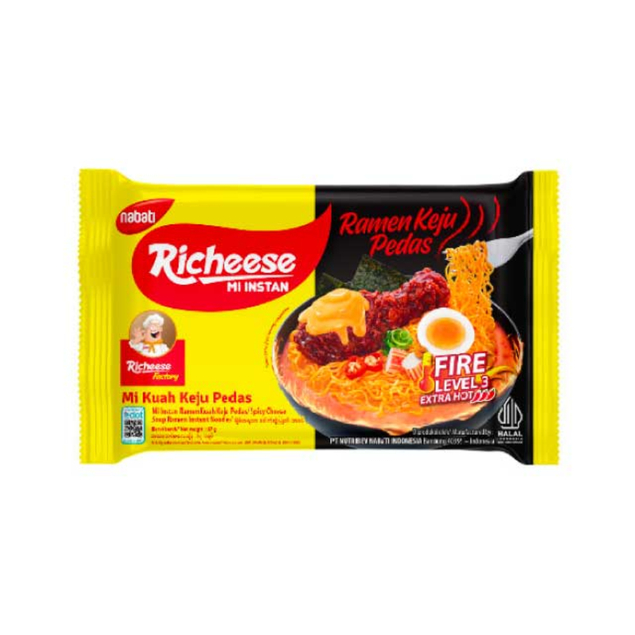 Richeese Mie Ramen Keju Pedas Lv3 Mie Instan 57 gram cocok buat kamu yang suka perpaduan gurih creamy keju khas Richeese dengan pedas yang nampol tapi masih nyaman di lidah, mi ramen-nya kenyal dan bumbunya nempel banget, pas jadi camilan atau makan praktis saat pengen sesuatu yang hangat, pedas, dan bikin nagih.