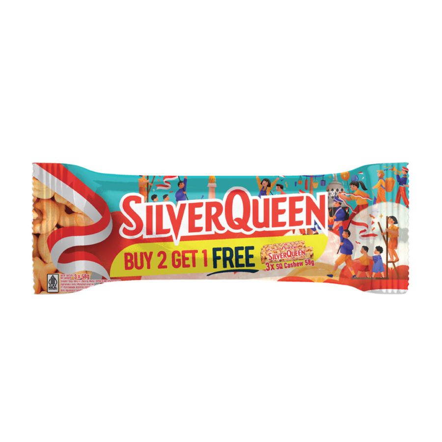 Silverqueen Cashew 3x58gr B2G1 adalah pilihan cokelat premium dengan kacang mede yang renyah. Dengan promo beli 2 gratis 1, nikmati kelezatan cokelat berkualitas tinggi dari Silverqueen.