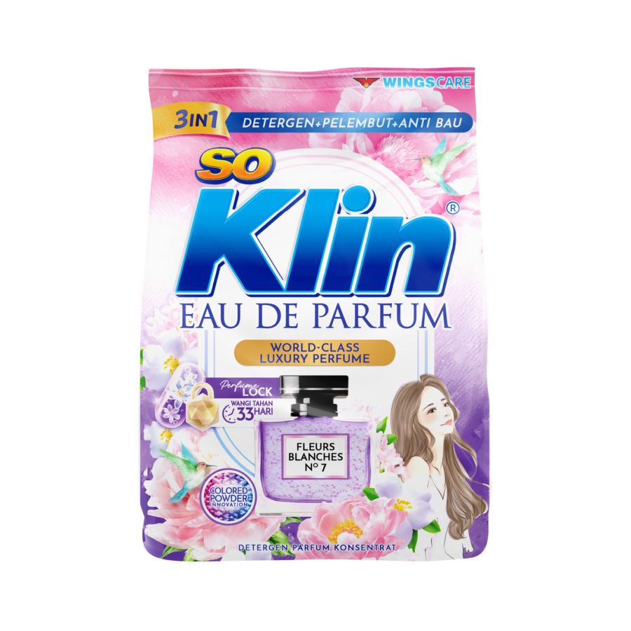 Inovasi terbaru dari SoKlin! Pertama di Indonesia, detergen parfum konsentrat dengan parfum mewah kelas dunia. Dengan teknologi baru, jadikan tiap butir detergen menyerap lebih banyak parfum, menghasilkan detergen berwarna ungu lembut dengan intensitas wangi tinggi & tahan lama yang menjaga keharuman hingga 33 hari. Varian Fleurs Blanches No.7 terinspirasi dari keanggunan dari paduan Bunga Rose, Jasmine, musk, dan aksen elegan khas fine fragrance. Aromanya halus namun berkarakter, memberi sentuhan mewah yang lembut pada pakaian Anda.