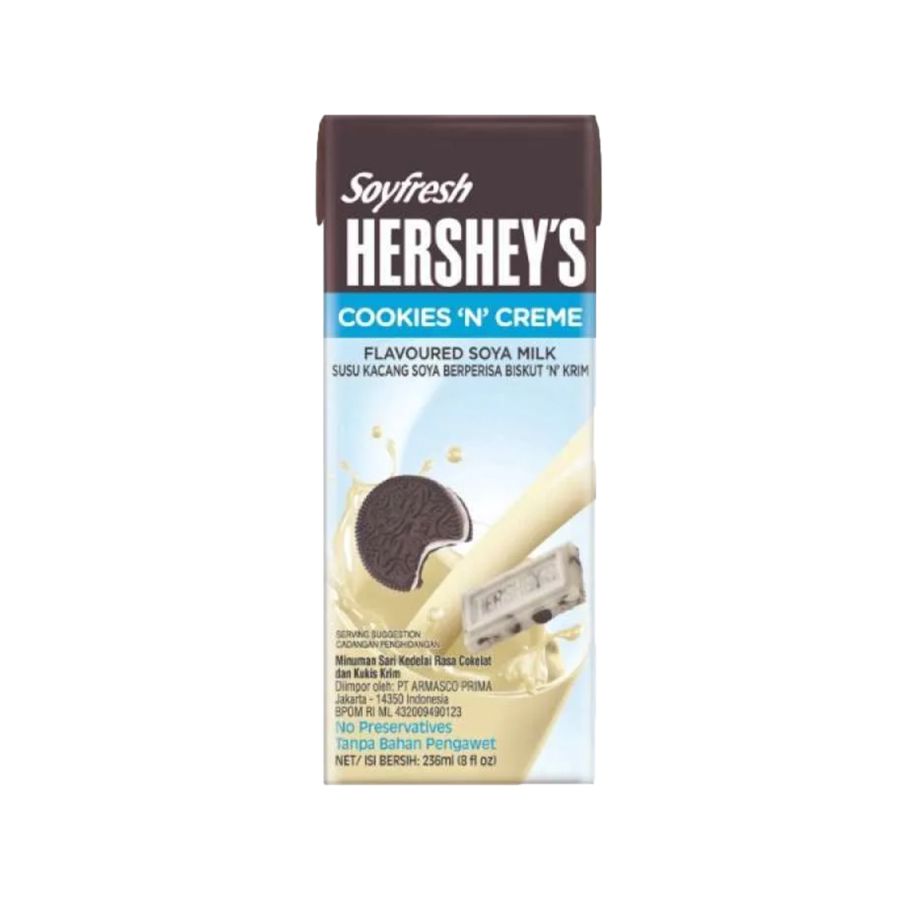 Rasakan nikmatnya perpaduan susu kedelai lembut dengan sensasi cookies & cream dalam Soyfresh Hershey’s Cookies N Creme 236 ml. Manis, creamy, dan kaya rasa, siap jadi teman asik untuk hari kamu!
