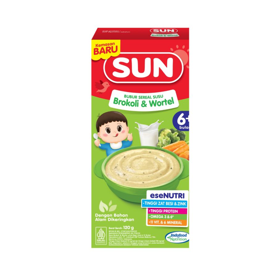 Sun Bubur Sereal Susu Brokoli Wortel Box 120gr adalah pilihan sempurna untuk memenuhi kebutuhan gizi harian si kecil. Dibuat dengan bahan-bahan berkualitas tinggi, bubur sereal ini mengandung campuran susu, brokoli, dan wortel yang kaya akan serat, vitamin, dan mineral.