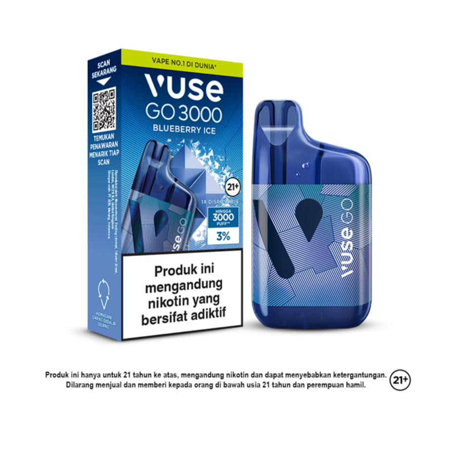 Vape No. 1 di Dunia* kembali berinovasi dengan produk vape disposable terbaru, VUSE GO 3000 dalam rasa bluberi dengan sensasi dingin menyegarkan.