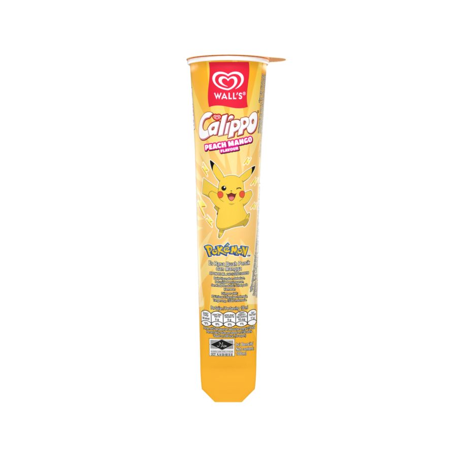 Es loli Calippo yang seru dengan tema Pokémon, menghadirkan kombinasi rasa peach dan mango yang manis, segar, dan tropikal. Teksturnya lembut dan menyegarkan, mudah dinikmati langsung dari kemasan Calippo yang praktis. Pilihan camilan dingin yang fun untuk anak-anak maupun penggemar Pokémon.
